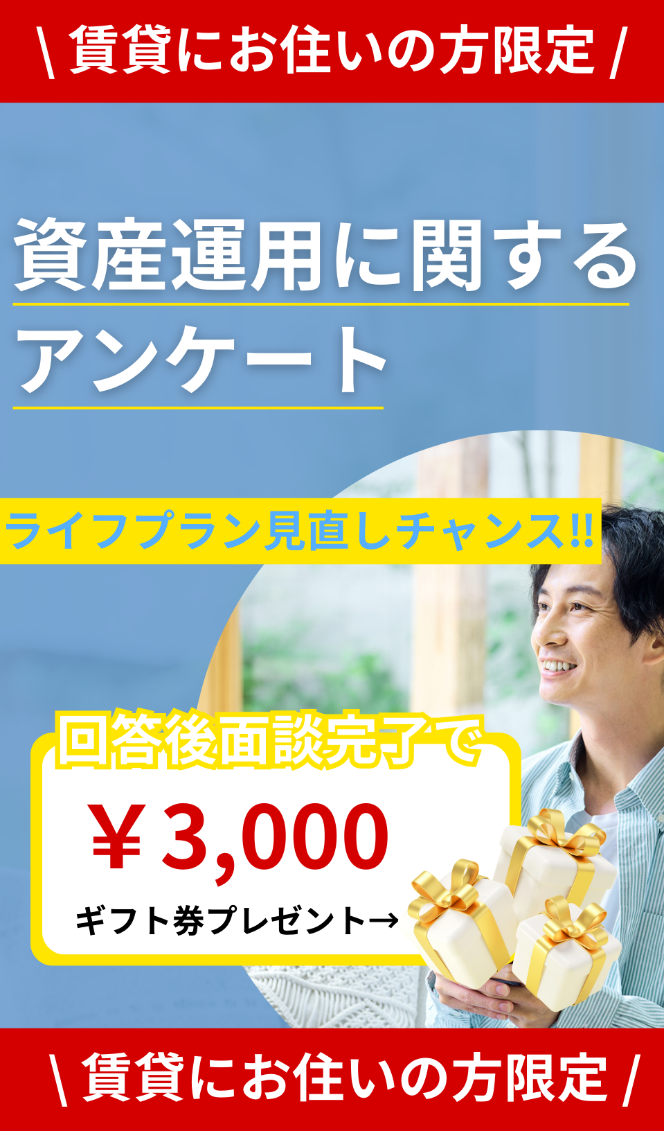 本ページ経由で個別面談をされた方で、条件を満たしたお客様に、ギフト券3,000円分を付与いたします。